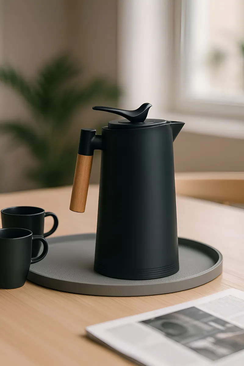 Garrafa térmica com design sofisticado e minimalista, ideal para quem busca funcionalidade aliada à estética moderna. O acabamento preto fosco transmite elegância e discrição, enquanto o cabo com efeito madeira adiciona um toque acolhedor e contemporâneo perfeito para ambientes com estilo escandinavo ou clean.